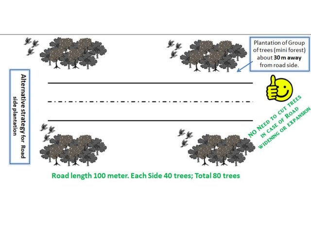 - Plantation can be carried out NOT in line but in groups to recreate mini-forest like scenario. A quick calculation says we can plant at least 80 trees in a stretch of 100mtr road (Refer the illustrated image below)