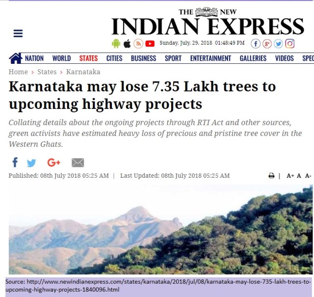 1. More than 7 Lakh trees to be cut for upcoming Karnataka Highway projects, published in “The New Indian Express” on 08 July 2018 (Image below). http://www.newindianexpress.com/states/karnataka/2018/jul/08/karnataka-may-lose-735-lakh-trees-to-upcoming-highway-projects-1840096.html