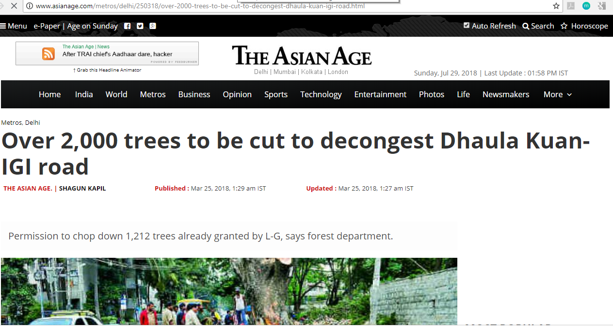 3. Over 2,000 tress to cut for road expansion in Delhi, reported by “The Asian Age” 25 March 2018. (Media reporting image below)