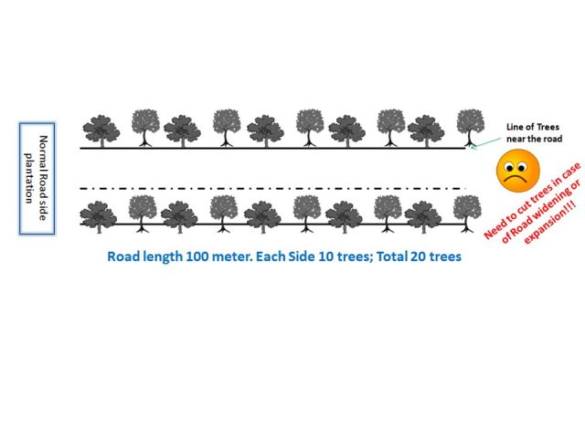 As discussed above the traditional roadside plantation doesn’t fulfill the maintaining the greenery as there is a good chance of cutting them again when they are fully grown. But an alternative approach can work… First, let us see an illustration of the current scenario.