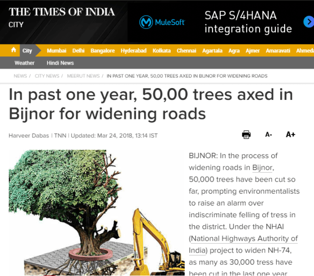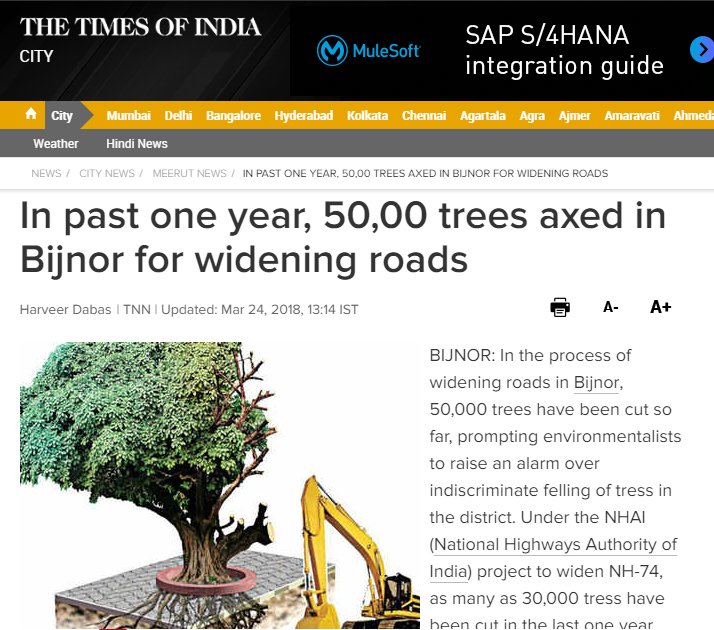 2. In past one year, 5000 trees axed in Bijnor for widening roads, reported by “Times of India” Meerut city edition on 24 March 2018. (Image below)