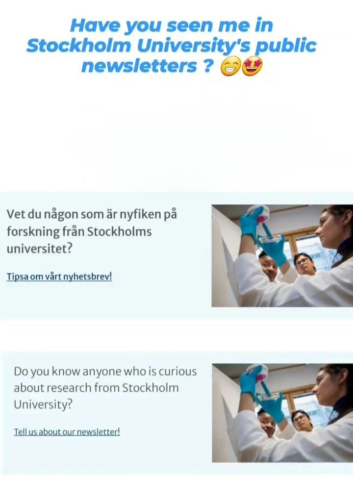 So, let me describe this event a little elaborately here. It was the morning of Wednesday 09:22 of 21st February 2024. The image was downloaded. I saw my image in the header of the Stockholm University News letter. It brought an unconditional smile on my face. It is a photograph of me while working in the lab at Prof. Andrzej Wojcik group in the department of molecular biosciences. In the photograph there are also my colleagues Pamela, Milagrosa, Sergey, and Mostafa are seen at different camera focal lengths and angles. The link to the newsletter is here and a screenshot is below.